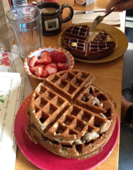 At some time this week, I looked at a picture of a waffle and thought out loud, “I wish I could have a waffle.” Bean heard me and promised to make me waffles this weekend. He used his recipe but substituted gluten-free flours for the whole wheat flour and here is what we ended up with…
