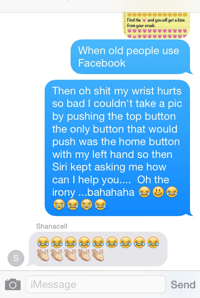 I sent her a screen shot of Mom’s meme [sorry Mom, no offense, it’s one of your charms, actually] followed by the text: “when old people use Facebook,” only in order to take this screen shot I had to be able to use my hand, which I couldn’t do.  My message read: